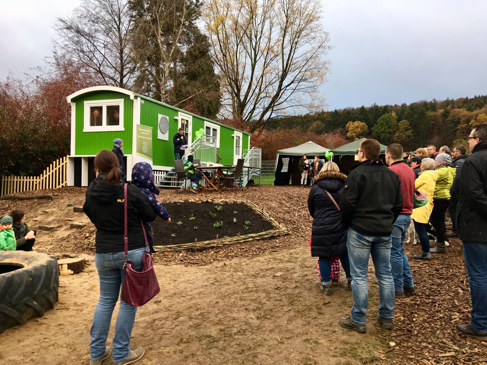 Der Wettergott meinte es gut mit uns und setzte den Regen während der gesamten Veranstaltung aus. Nach den Redebeiträgen der Leiterin, der ersten Vorsitzenden sowie des Prinzen de Merode folgte das vorgetragene Lied der Wildschweinbandenkinder. Neben einem leckeren Kuchenbuffet und einem Kreativangebot mit Naturmaterialien durfte die Besichtigung des Bauwagens nicht fehlen!